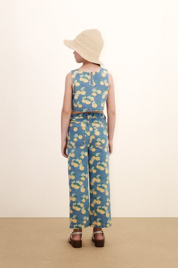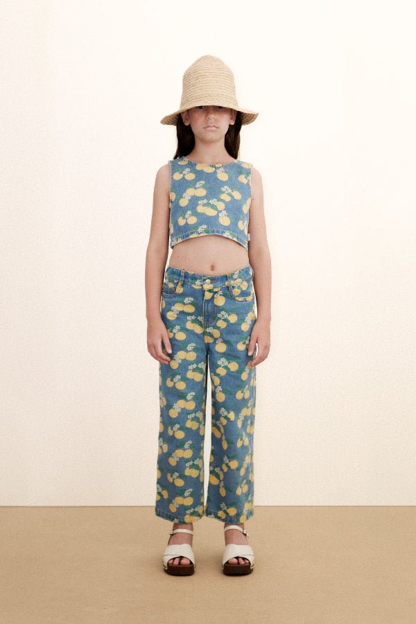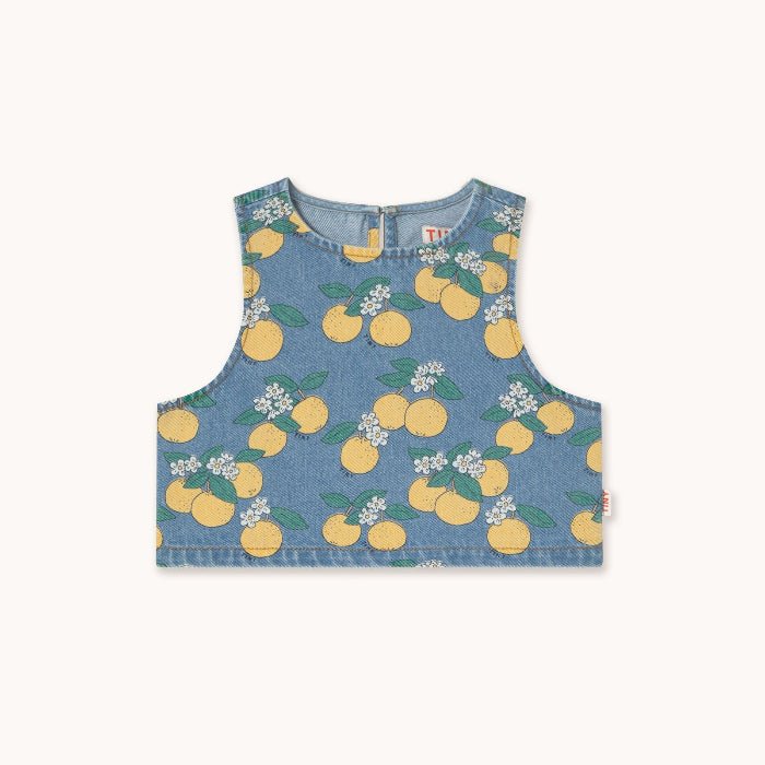 Sleek, breathable, and bursting with character. This sleeveless denim crop top showcases a vibrant Oranges print that brings instant personality to your everyday look. Designed with a round neckline and convenient back opening, it slips on effortlessly for those warm, carefree days. The lightweight fabric keeps you cool while the cropped silhouette delivers modern edge. Perfect for layering or wearing solo, it's your go-to piece for casual outings with undeniable style.