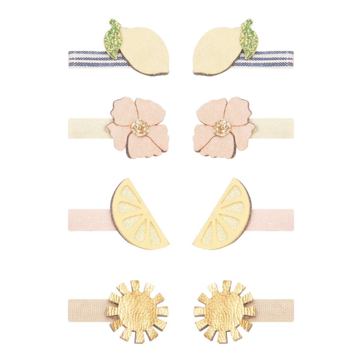 Fabric covered alligator clips with lemons, flowers and suns all crafted from a pretty mix of soft suedette, glitter and metallic fabrics