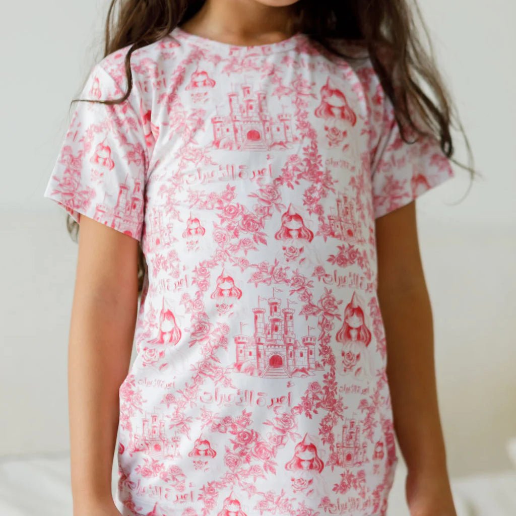 Amira, meaning “princess” in Arabic, is a charming short-sleeve top and pants set inspired by delicate florals and timeless princess themes. Adorned with castles, regional princesses, and the phrase أميرة الأميرات (“princess of princesses”), this enchanting design will make your little one feel truly royal.