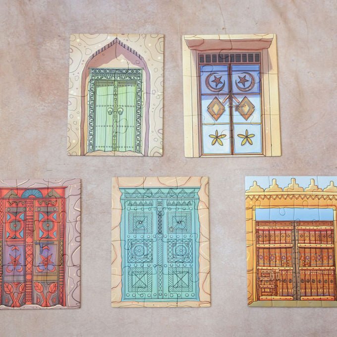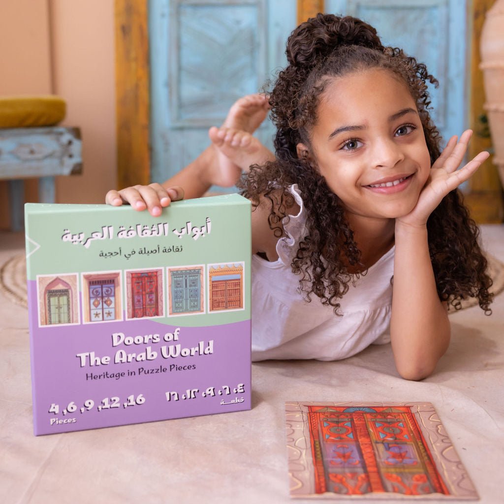 Doors of the Arab World Puzzle Unlock the beauty of the Arab world with this traditional door puzzle set, inspired by the charming old doors of the Middle East. Each puzzle, ranging from 4 to 16 pieces, is designed to grow with your child, sparking curiosity and introducing them to the doors our parents and grandparents once walked through—one piece at a time.