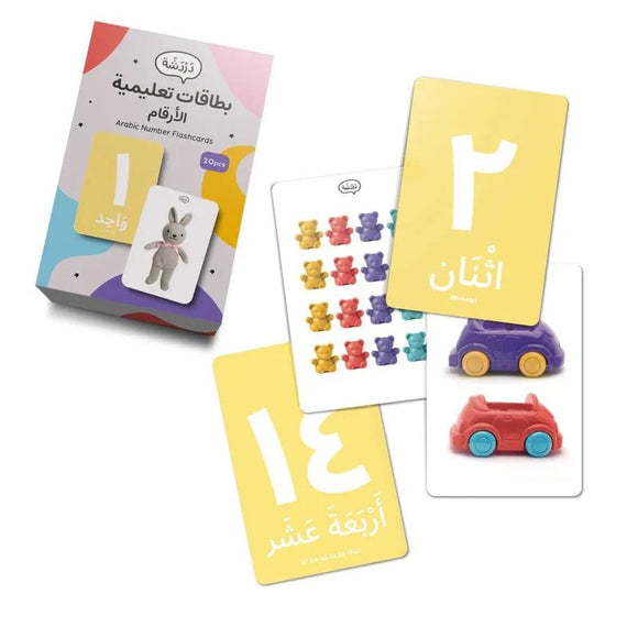 Elevate your child's numeracy skills with these flashcards that include Arabic numbers 1-20! Each card showcases the numeral, its Arabic name, the English transliteration, and objects to count, creating a fun and effective learning experience.