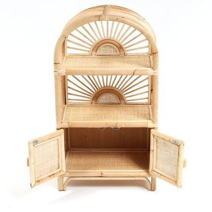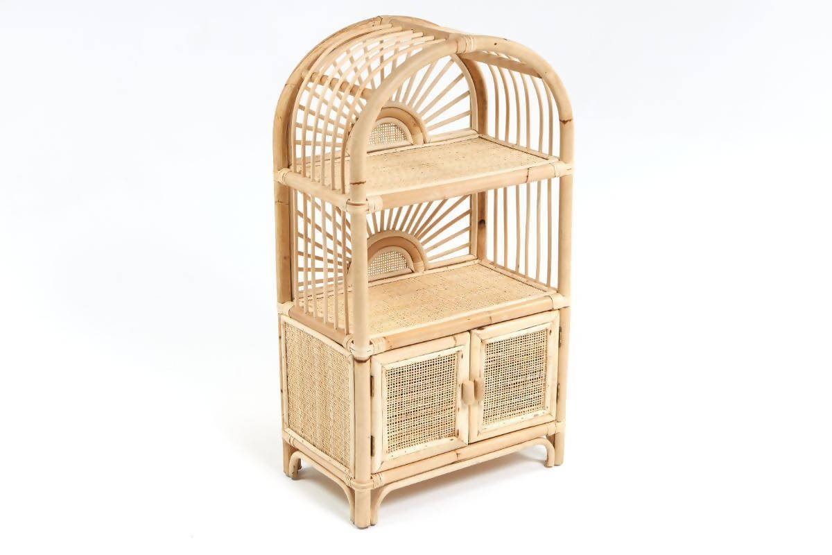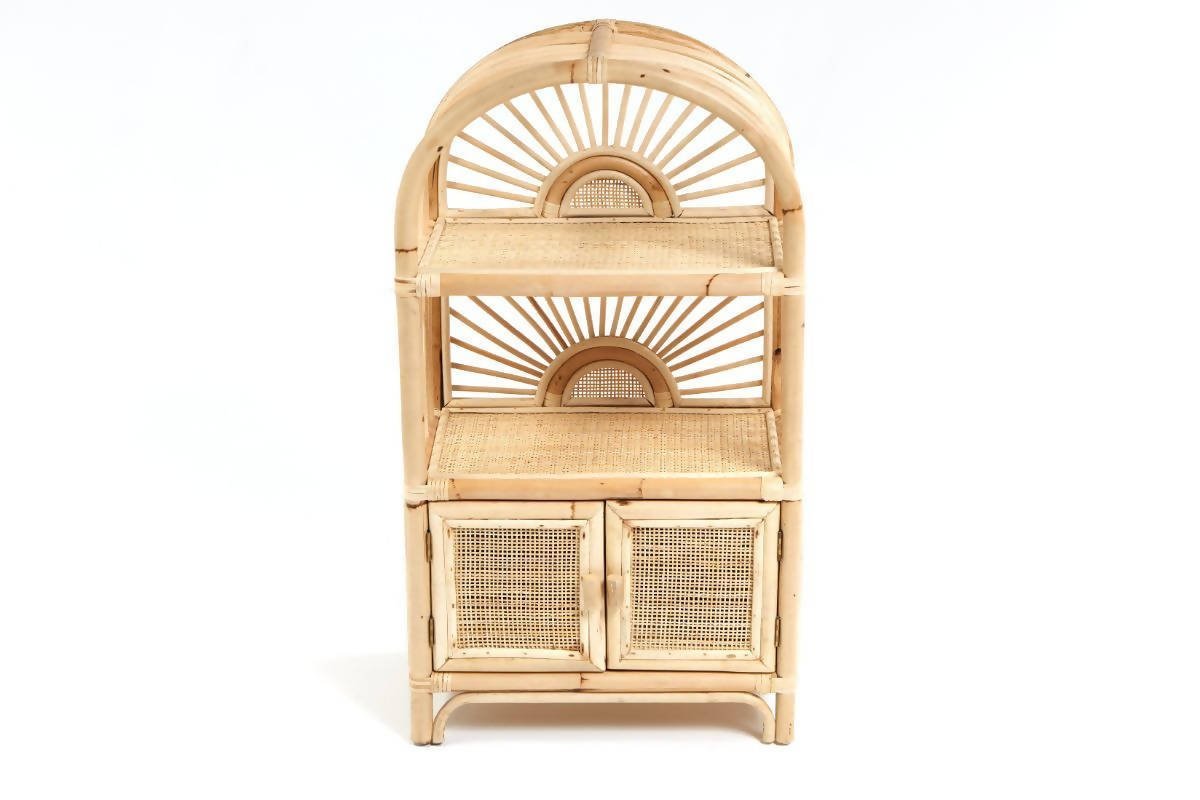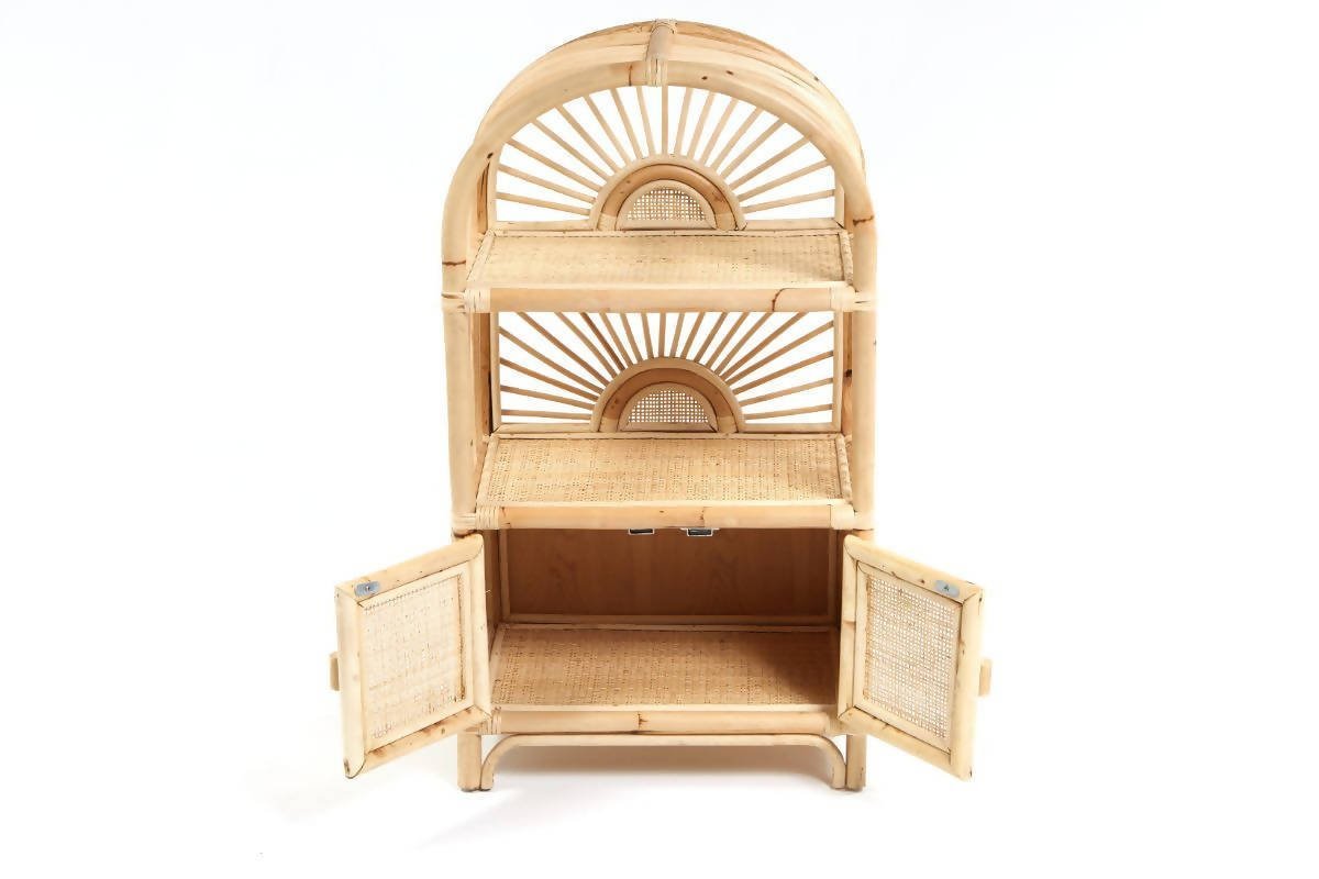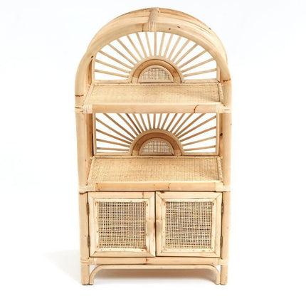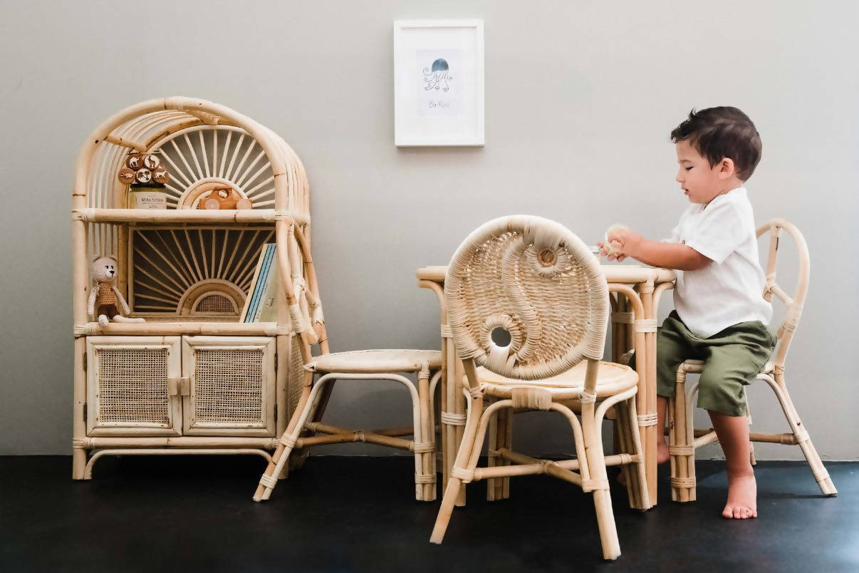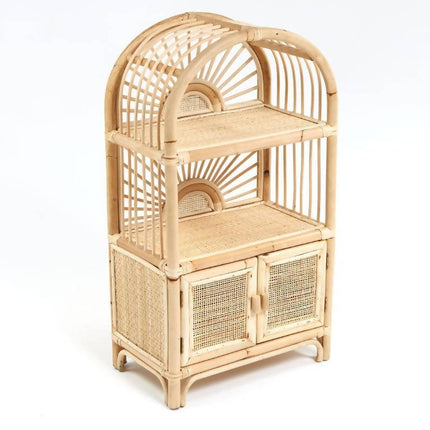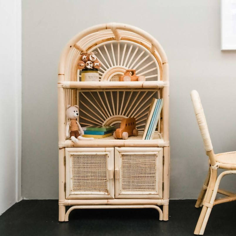 Bring the sunlight in and add an uplifting touch to your childs bedroom or playroom. This cabinet is your child's own little shelving unit to store books, toys, and anything their heart desires to display. A rattan airplane looks really good in here!