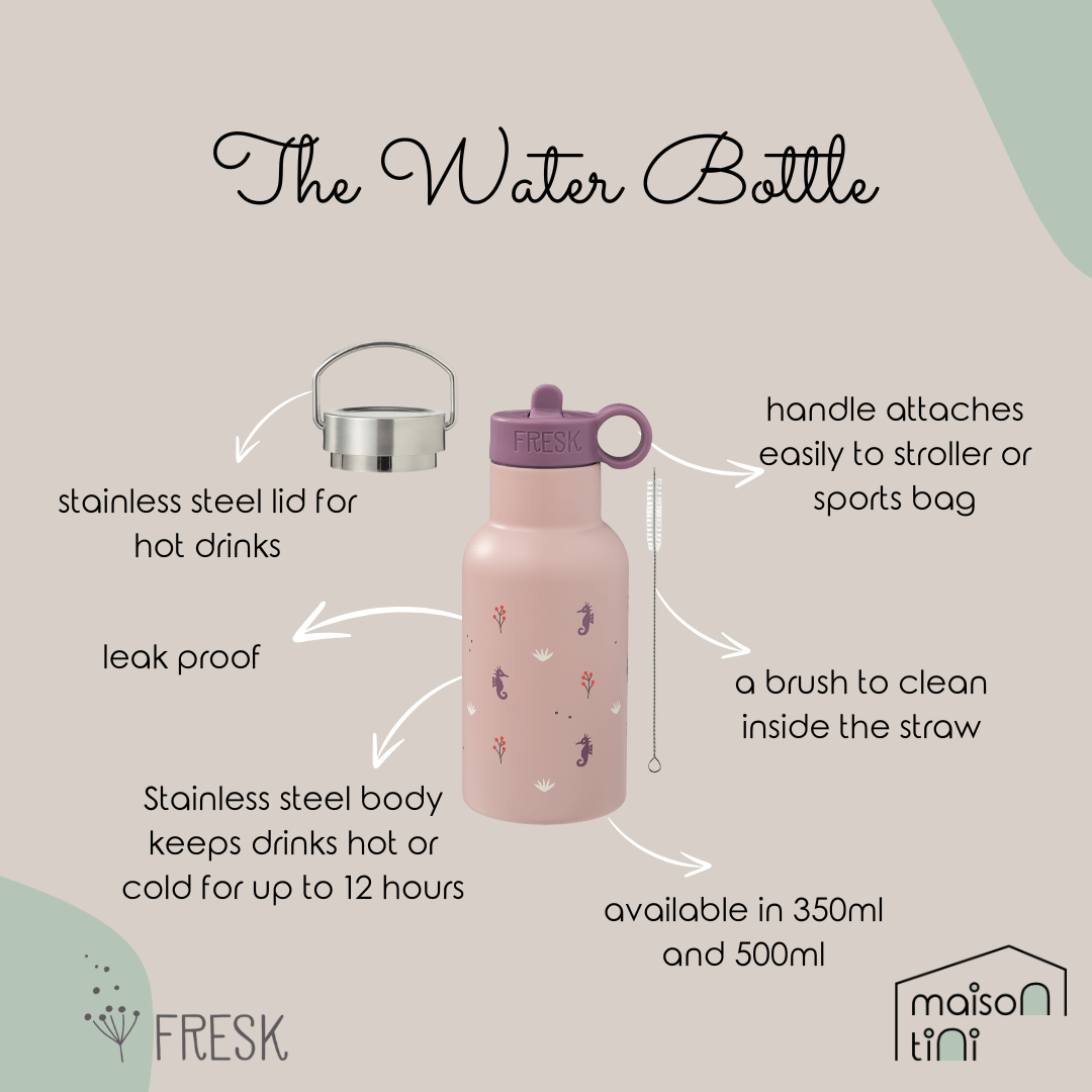 Fresk thermos bottle holds 350ml of liquid and keeps it warm or cold for up to 12 hours.