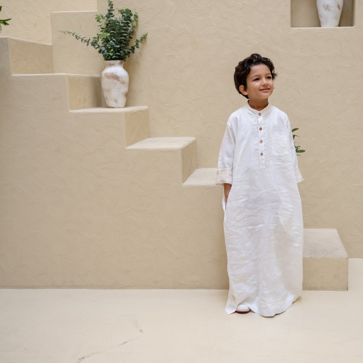 Introduce your little one to timeless elegance with this crisp white linen thobe! Perfect for Eid morning prayers or those special Ramadan moments, this piece combines comfort with style. The breathable linen fabric keeps him cool and comfortable throughout the day, while the classic cut ensures he looks absolutely dapper. Whether it's a family gathering or a spiritual occasion, this thobe is the go-to choice for making those precious moments even more memorable. Simple, sophisticated, and oh-so-handsome!