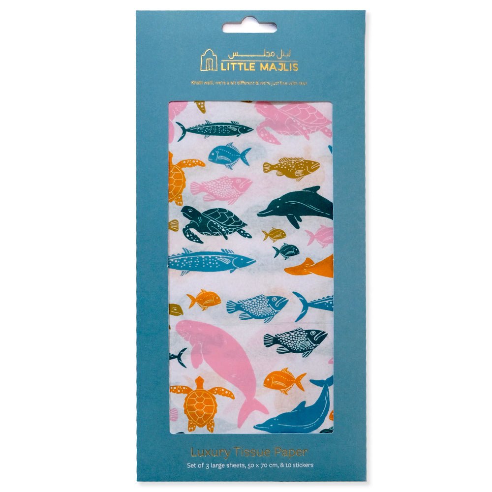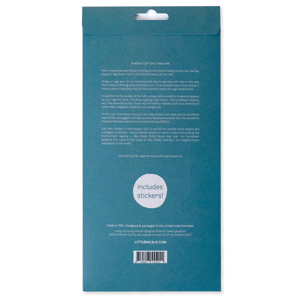 Set of 3 large sheets of luxury tissue paper (50 x 70cm) and 10 stickers featuring Arabian Gulf sea creatures, including dugongs (sea cows), the hamour, the humpback dolphin and the hawksbill turtle.