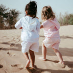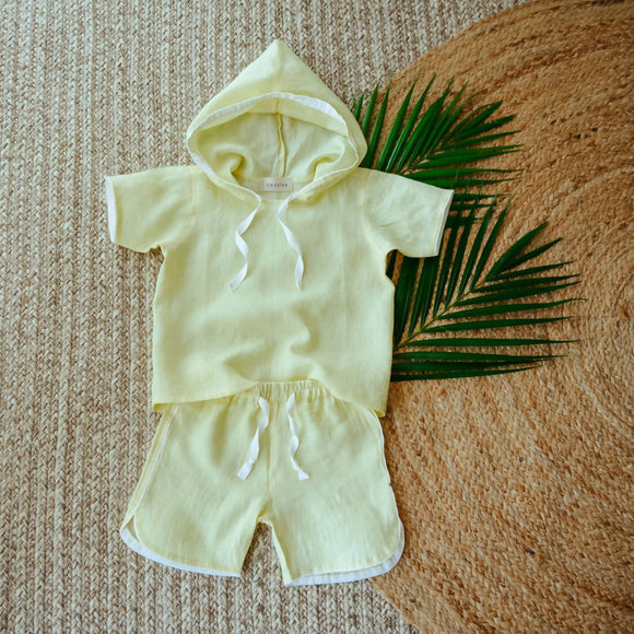 Introducing Rory Set by Cuddles! The perfect summer outfit for tiny adventurers to explore the beach with. This linen set is comfy, breathable, and stylish—featuring a round neck linen shirt with a hood plus matching shorts with a white trim—ready to take those little explorers of yours on their wildest adventures!
