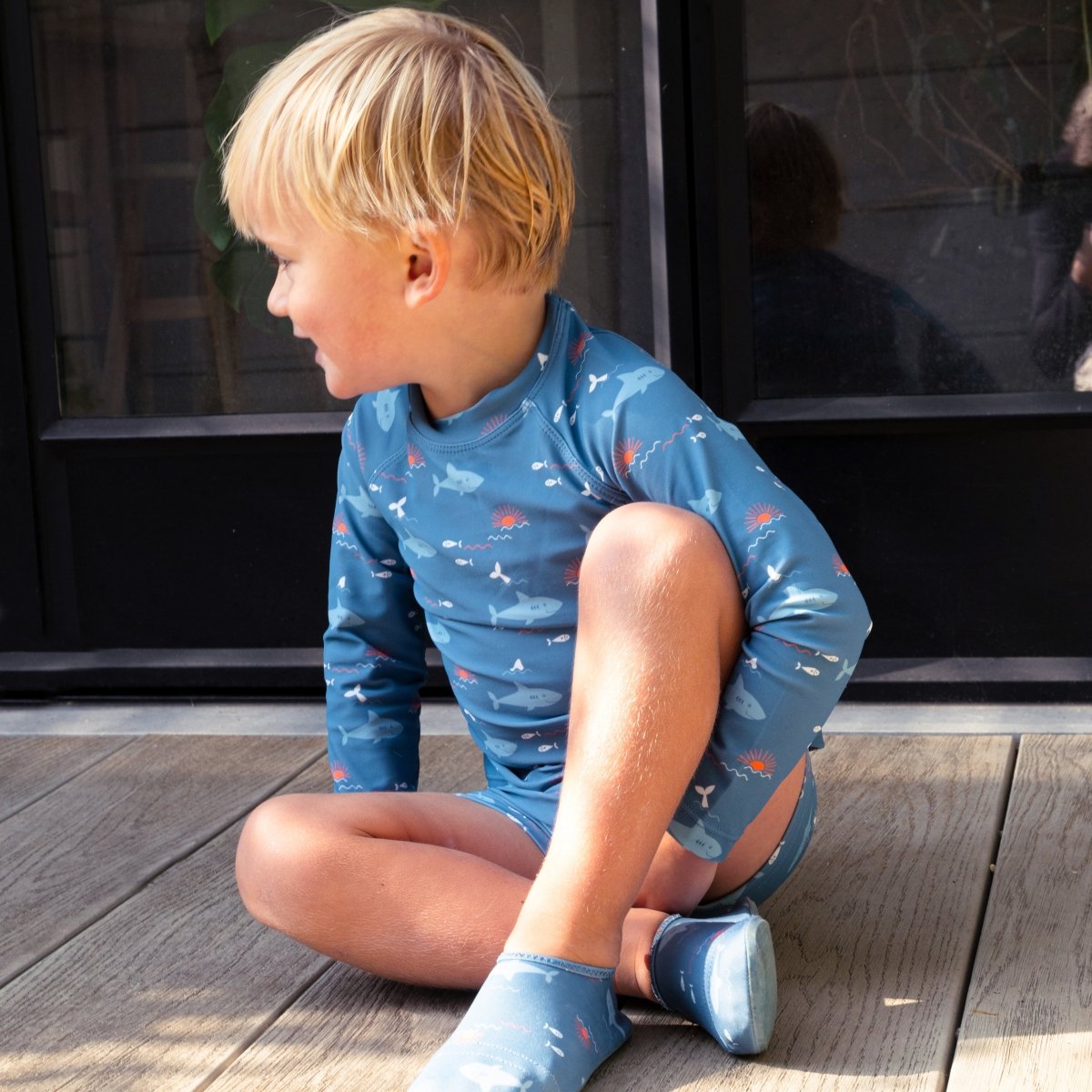 The adorable Fresk long-sleeved swim shirt adds even more beauty to your beach or pool day. Designed with built-in UV protection, it keeps your little water enthusiast's sensitive skin safe from the sun. The durable material, long sleeves, and short stand-up collar offer added sun protection. (Just don't forget the sunscreen for the rest of your body!)