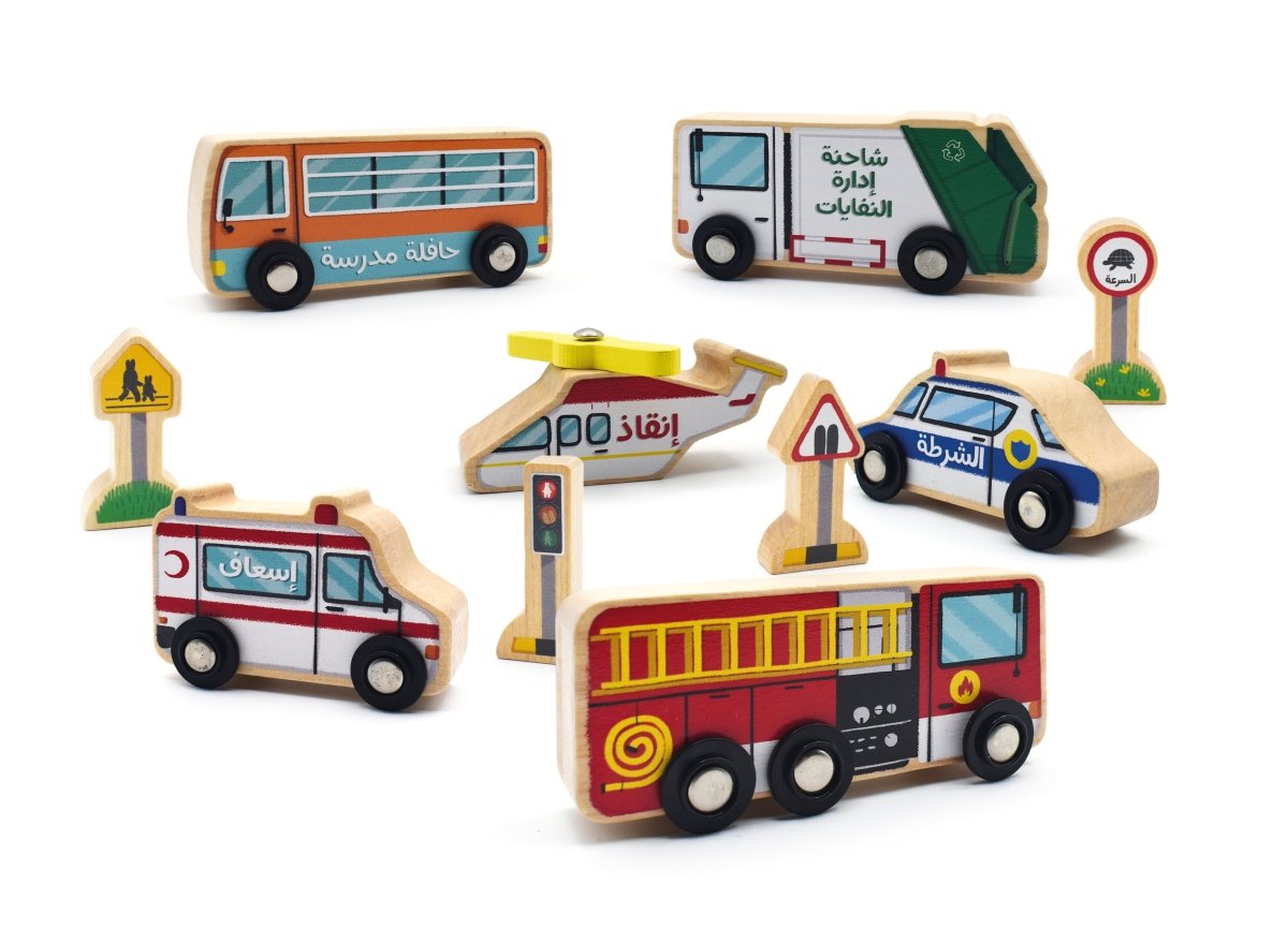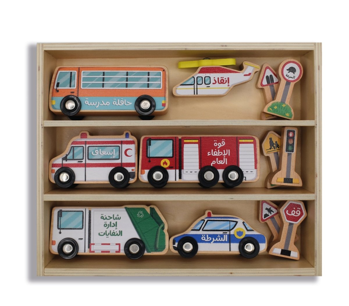 Ignite your child’s creativity and take their imaginative play to new heights with this delightful wooden vehicle set...in Arabic! Featuring an ambulance, fire truck, garbage truck, police car, helicopter, school bus, and six traffic signs, this high-quality set invites little ones to explore the bustling world of transportation and city life.