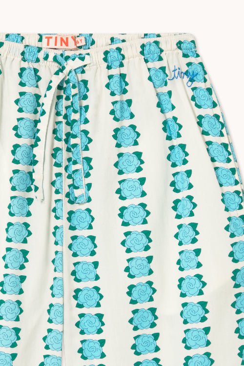 Effortless comfort with a floral twist. These lightweight woven pants feature a delicate blue flowers print on an off-white base, blending charm and everyday ease. Designed in a relaxed fit with a gathered waistband for all-day comfort, plus side internal and back pockets for that practical touch. Made from 100% cotton, they're perfect for an easy, stylish look.