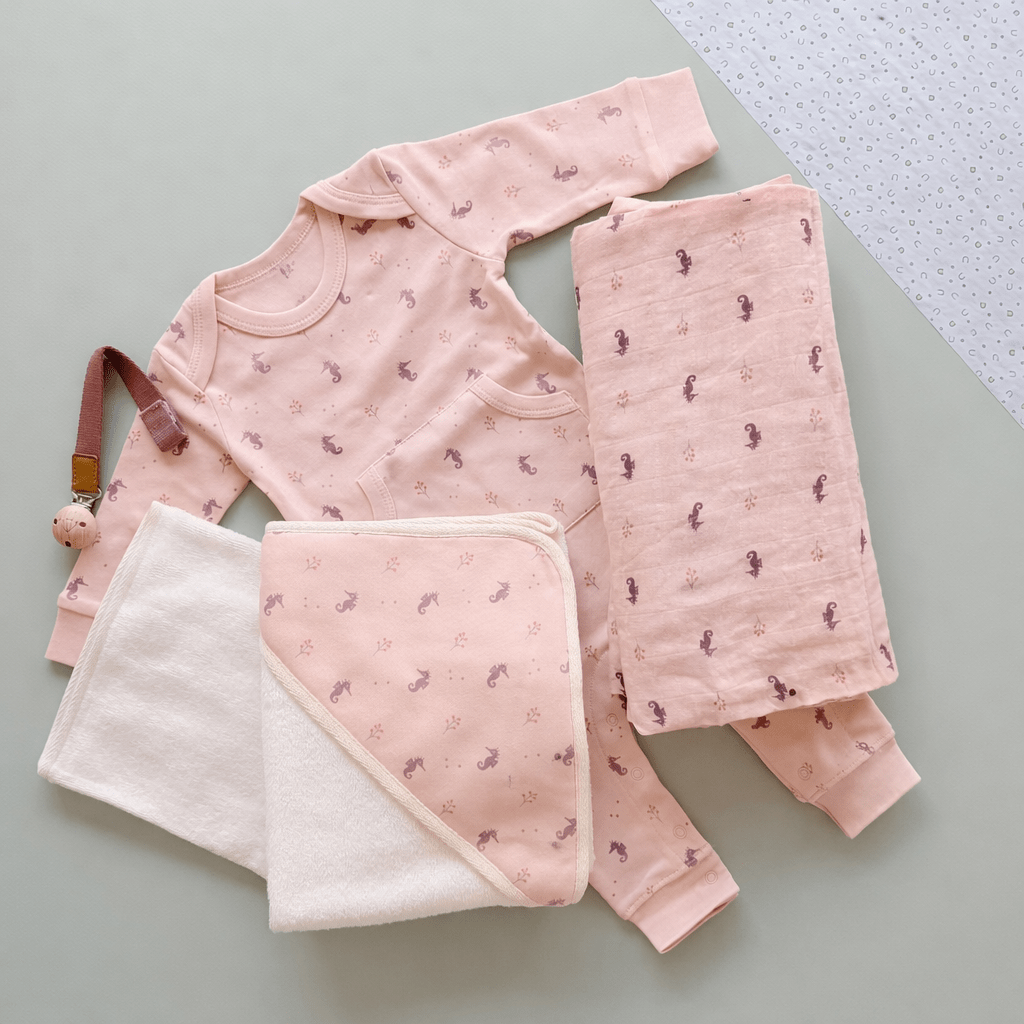 Celebrate a new arrival with our beautifully curated Seahorse Baby Gift Box. Curated in gentle hues and soft textures, this beautiful set includes essential pieces to keep newborns cozy, comforted, and cared for from day one.