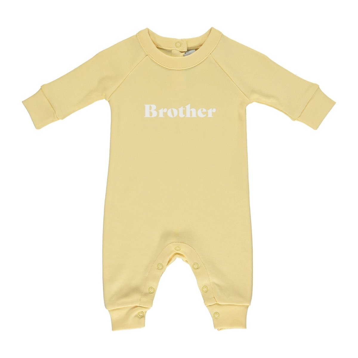 Lookin' for a unique way to show off your sibling love? This Brother All in One from Bob and Blossom is the ideal way! Crafted from beautiful sherbet yellow cotton with a white 'Brother' slogan, this all-in-one comes with long sleeves and popper fastening for easy on-and-off. So don't be shy - share the love (and the cuteness!) with your Brother All in One!