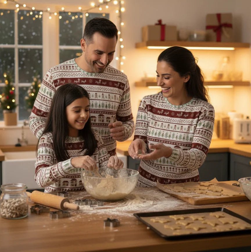 Wrap your family in festive cheer with Nohm's Christmas Long Sleeve Kids Pajama, where holiday magic meets everyday comfort. This playful set features a charming gingerbread man sporting a traditional tarboush, a cozy levant house dusted with snow, and the warm greeting "عيد مجيد" woven throughout. Perfect for creating matching moments with siblings and parents, these pajamas turn bedtime into a celebration of togetherness and joy. Crafted from luxuriously soft bamboo fabric, they're breathable and gentle on delicate skin while keeping everyone snug and cozy. Ideal for holiday photos, festive sleepovers, and those magical mornings when the whole family stays in their pajamas.