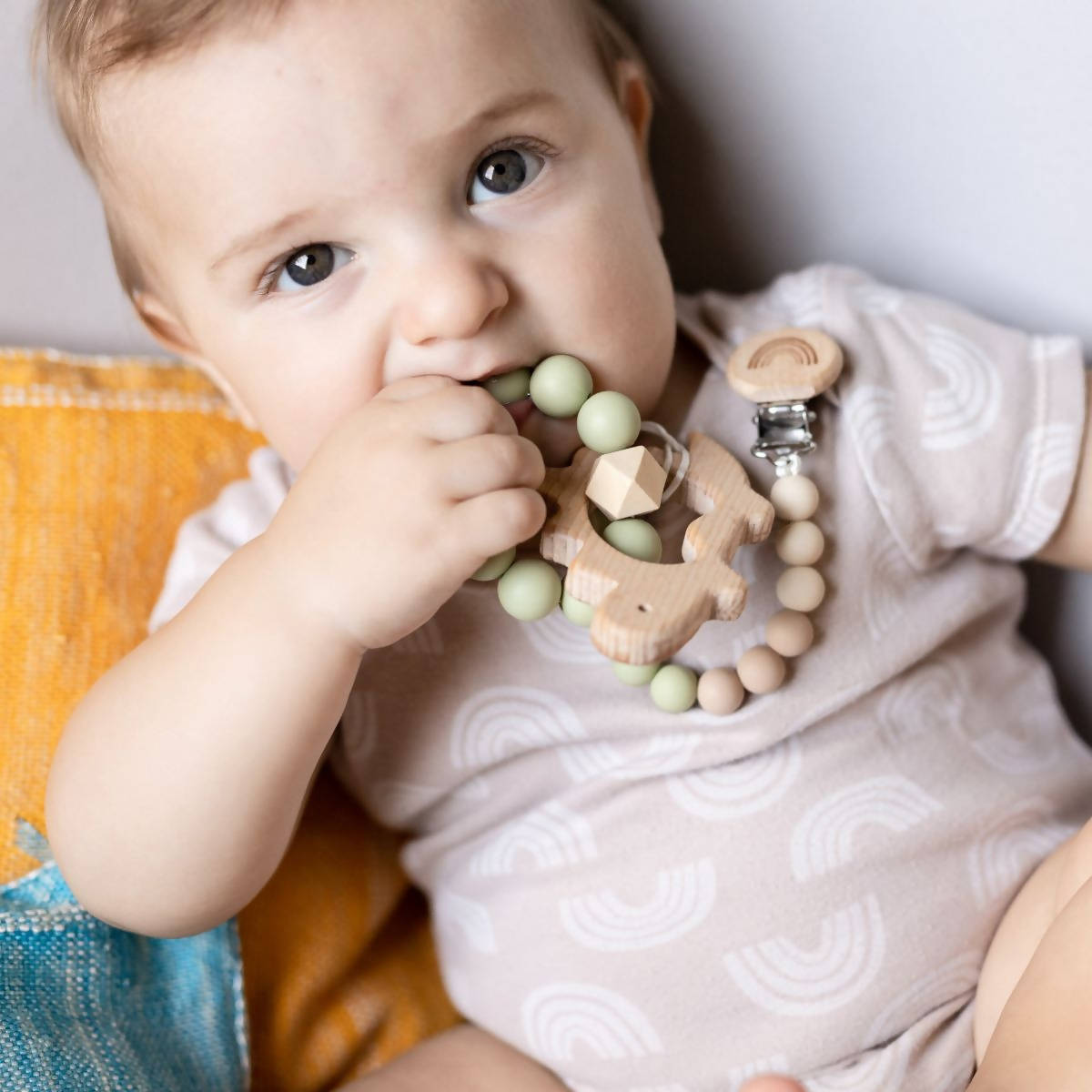 Never drop your babys pacifier again! Our Little Necklace pacifier clips are designed to keep your babys pacifier safe and within reach. They are made of food grade soft silicone beads, which help soothe your babies gums on their teething journey. Clips easily on blankets, clothes, car seats, and strollers.