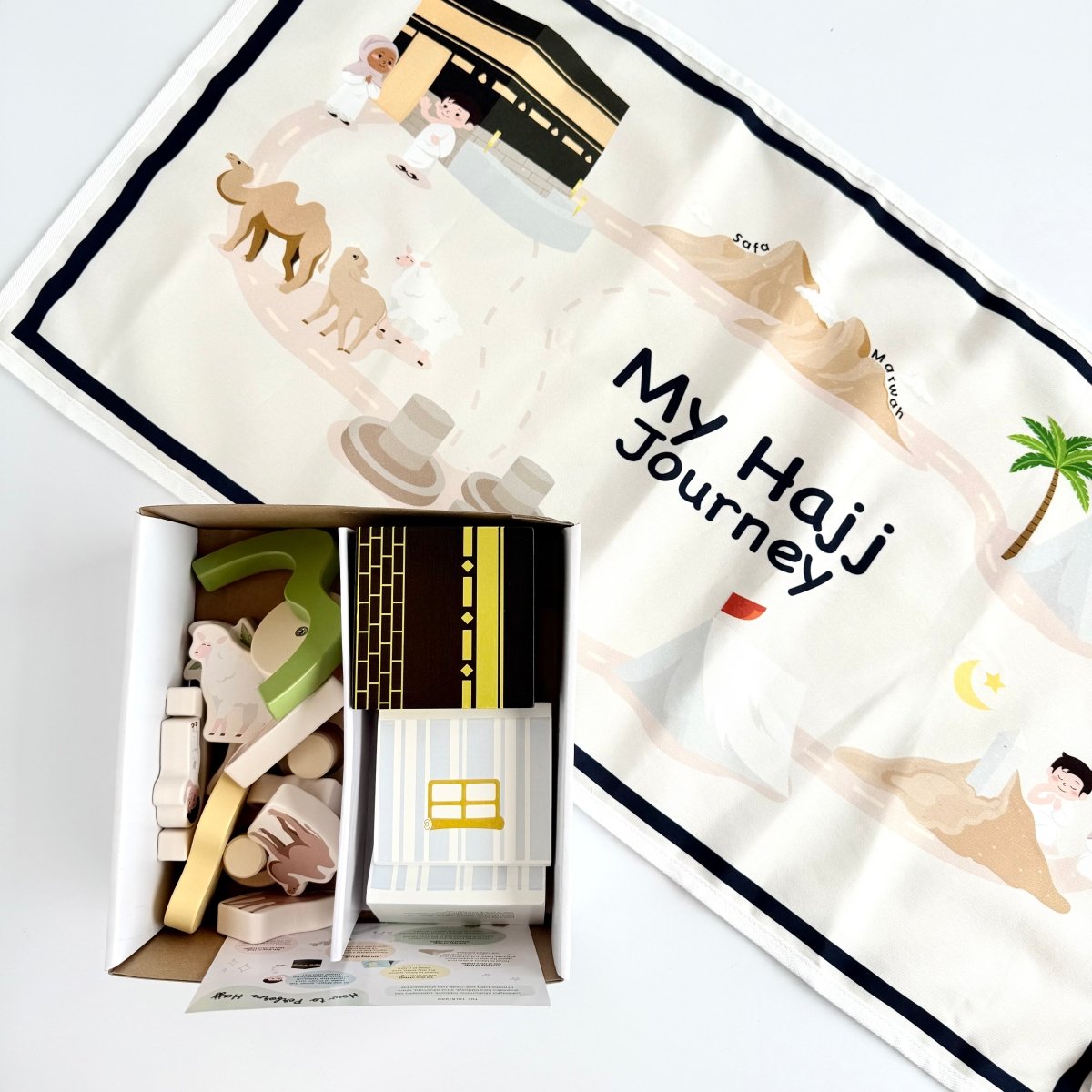 Little hands can explore the journey using the included 100% cotton play mat — a Hajj playmat for kids — which outlines the entire Hajj experience, helping children visualize and engage with the process of Hajj in an interactive way.