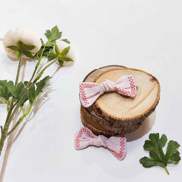 Add a touch of elegance to your tini's hair with our embroidered linen bow clips by Bow & Co. Handmade by talented Palestinian mothers at the Husn Refugee camp in Jordan, these clips feature beautiful embroidery on soft linen fabric. Perfect for any occasion, they make a great gift and support a good cause.
