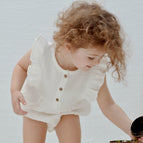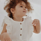 Show off her ethereal beauty with the Marie Bodysuit from Eli & Nev. This romantic bodysuit is made from 100% organic muslin cotton, offering a light and airy feel that your little princess will love. With a ruffled feminine shoulder trim and coconut buttons, it’s the perfect piece to complete any outfit. And with a snap-button fastening at the gusset for easy diaper changes, you won't believe how effortless getting ready can be!