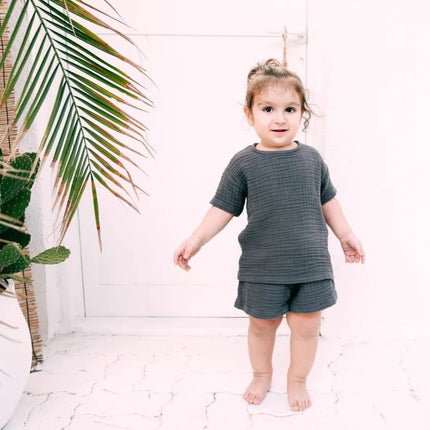 Expertly made with GOTS certified 100% cotton, Beaux Desert's matching sets are a must-have for any tini's wardrobe. The loose, relaxed design ensures long-lasting wear and superior comfort, making them ideal for delicate skin. With versatile, unisex colors, these high-quality products can be shared and easily paired, extending their durability.