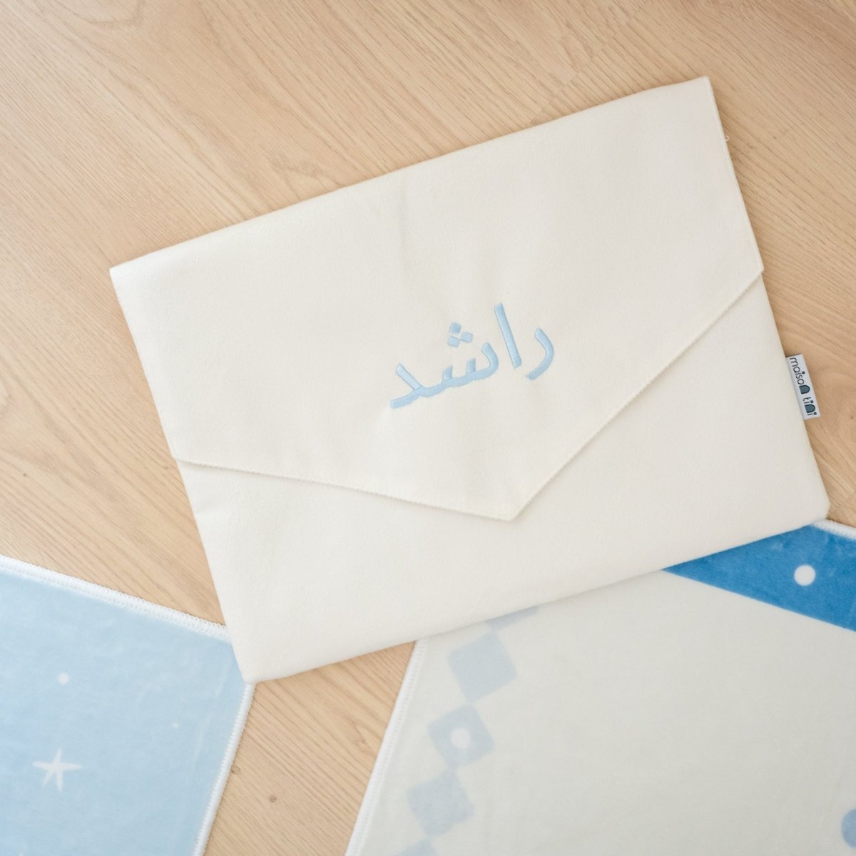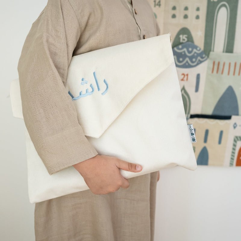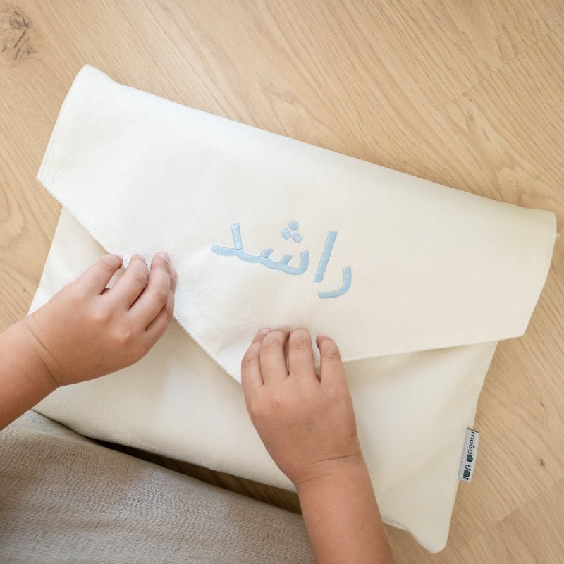 Prayer mat comes packed in a beautiful cream velvet pouch with FREE name personalization (available in PINK & BLUE & GREEN thread only)