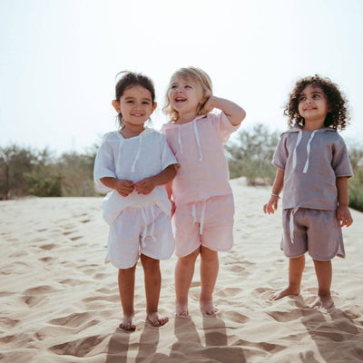 Introducing Rory Set by Cuddles! The perfect summer outfit for tiny adventurers to explore the beach with. This linen set is comfy, breathable, and stylish—featuring a round neck linen shirt with a hood plus matching shorts with a white trim—ready to take those little explorers of yours on their wildest adventures!