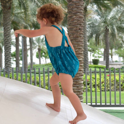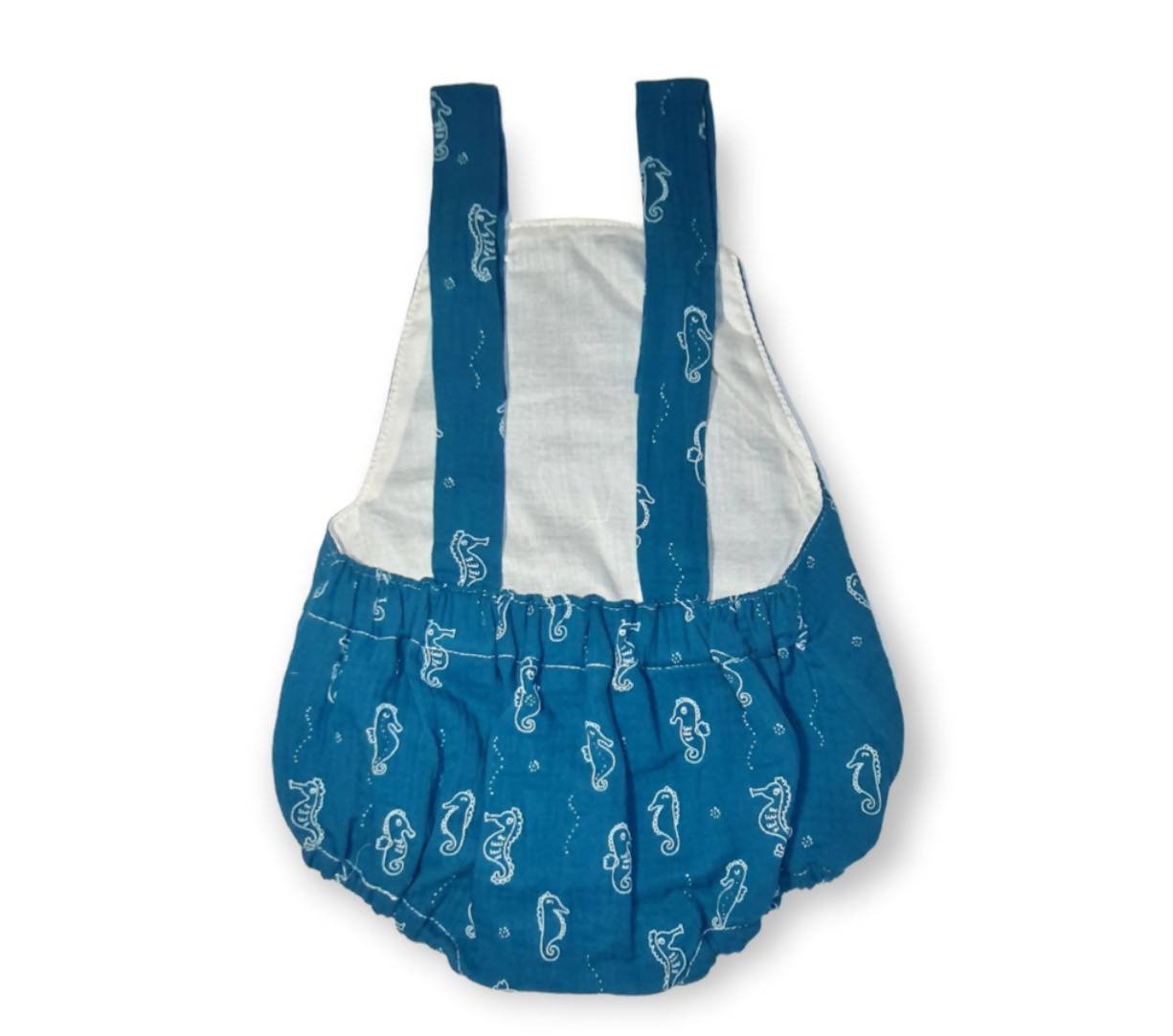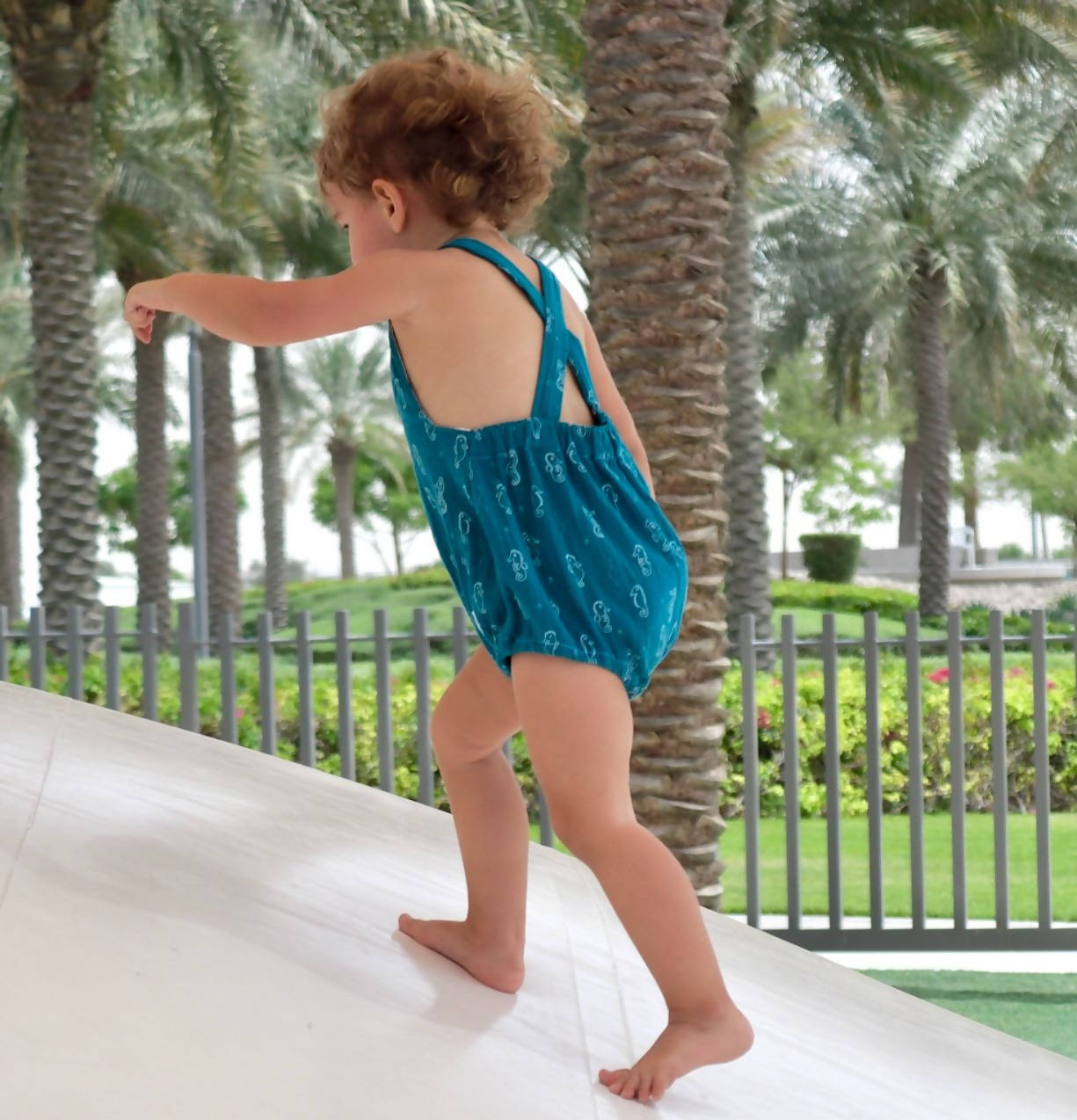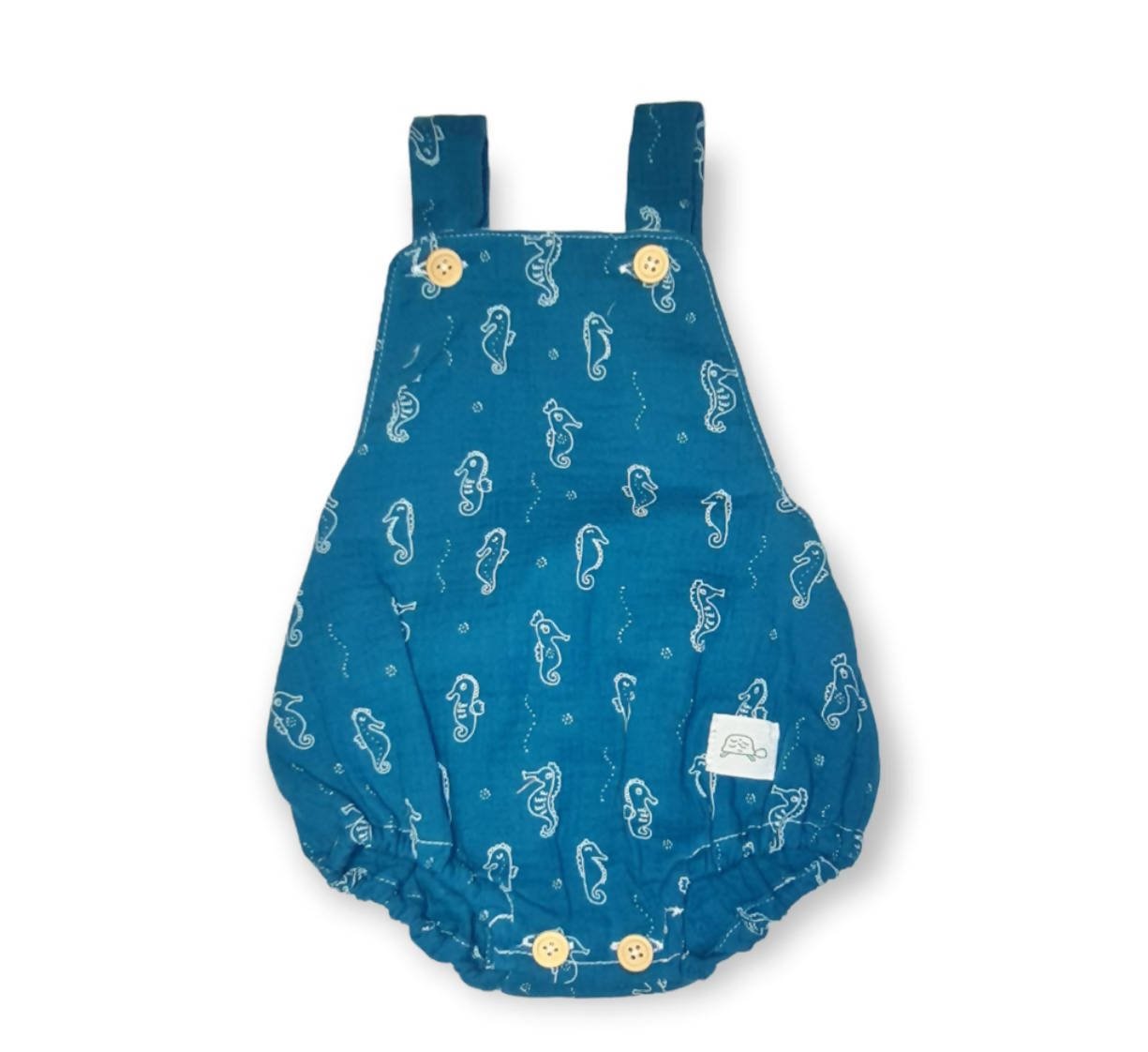 Keep your tini comfortable while staying in style in this seahorse printed romper by La Tortuga Marisa. Features a cute crossover back making this a perfect summer outfit that will never fade out of style. Beware, only for vitamin-Sea lovers!