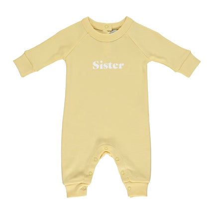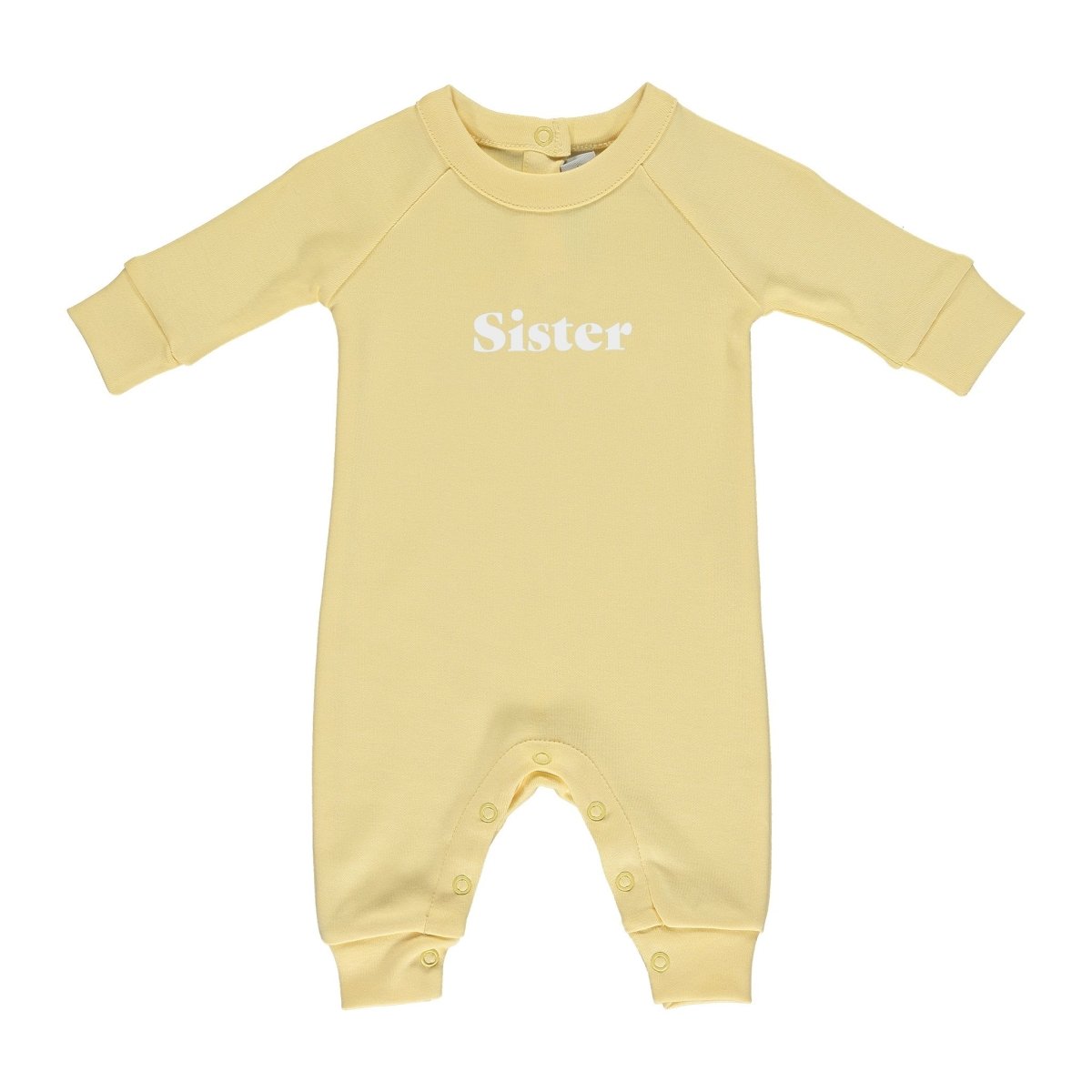 Lookin' for a unique way to show off your sibling love? This Sister All in One from Bob and Blossom is the ideal way! Crafted from beautiful sherbet yellow cotton with a white 'Brother' slogan, this all-in-one comes with long sleeves and popper fastening for easy on-and-off. So don't be shy - share the love (and the cuteness!) with your Sister All in One!