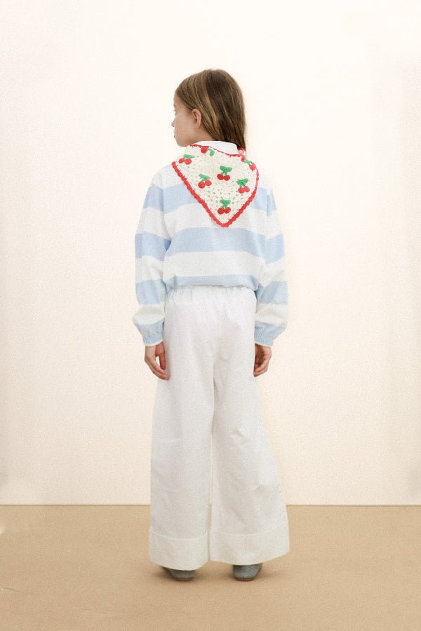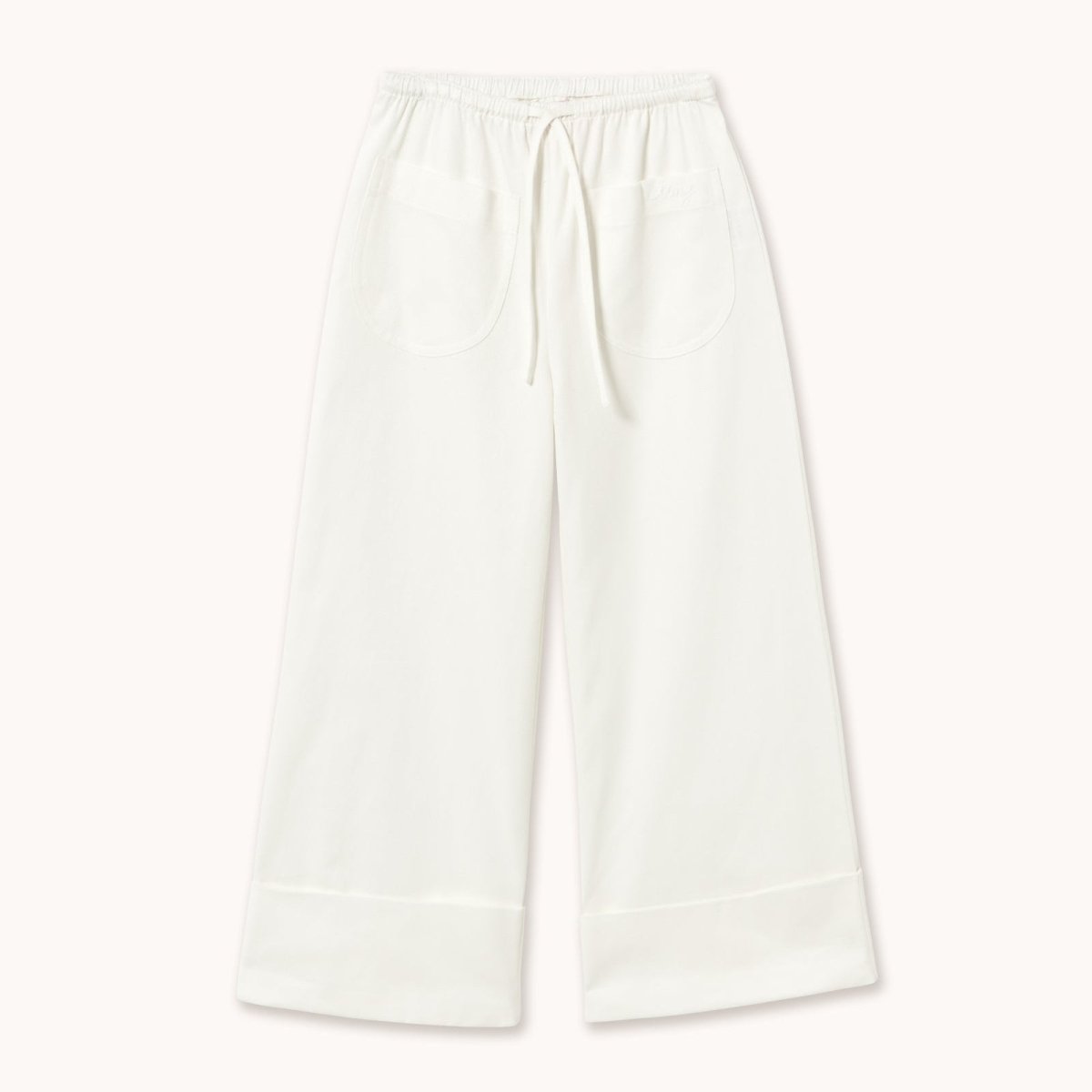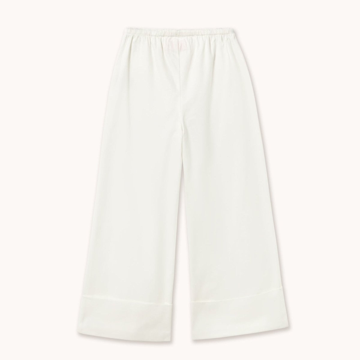 Relaxed, comfy, and effortlessly stylish ✨ These long pants in soft off-white twill blend comfort and modern charm. Featuring an elastic waistband with an adjustable drawstring for a perfect fit, roomy front pockets for playful practicality, and a wide folded hem for a polished finish. Made from 100% cotton, they're ideal for casual, everyday adventures.